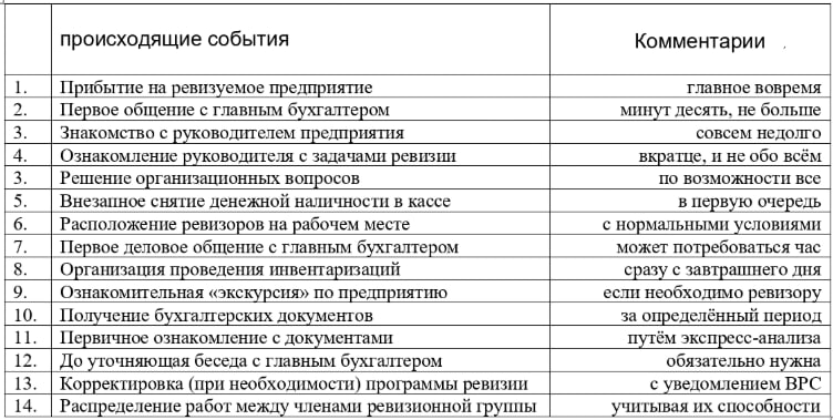 На самом деле всё может происходить совершенно иначе. Главбуха не быть на месте, а руководитель не сочтёт нужным встречаться. Кассу снимать не придётся, поскольку ни кассовых операций ни наличных денег нет или почти нет, а инвентаризация не предусмотрена программой. И, вообще, это может быть вовсе не ревизия, а обыкновенная небольшая проверка. В приведённой табличке, скорее, интересны комментарии.